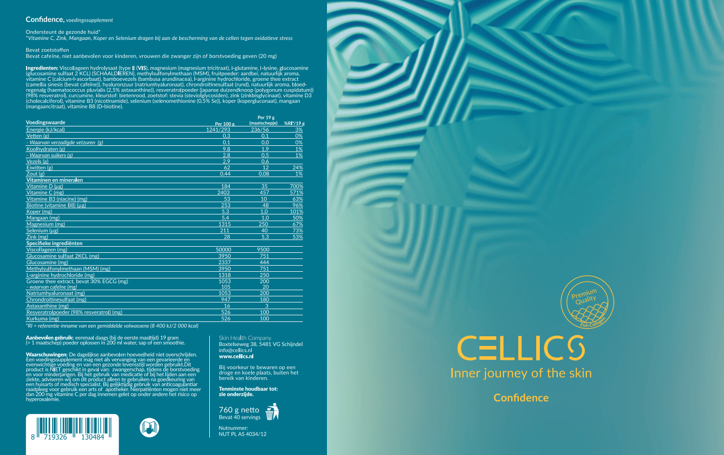 Het product is ontwikkeld met de meest zuivere ingrediënten, zonder onnodige toevoegingen, zoals smaak- en vulstoffen. In vergelijking tot Inspiration is Confidence hoger gedoseerd en speciaal ontwikkeld voor iedereen die alleen het allerbeste voor de huid wil, een extra boost kan gebruiken (bijvoorbeeld na een periode van stress, slaaptekort of ziekte) en voor de huid vanaf 50+. Vanaf die leeftijd is de natuurlijke aanmaak van stoffen die essentieel zijn voor het behoud van een gezonde huid en lichaam aanzienlijk afgenomen in vergelijking met toen je 25 was.